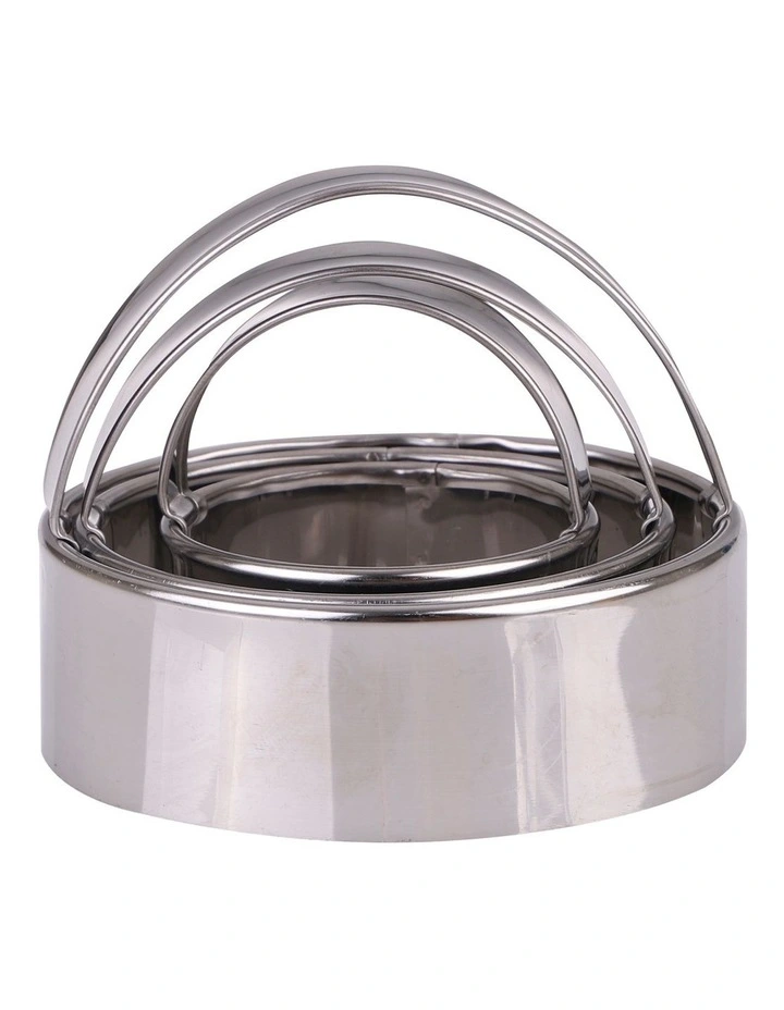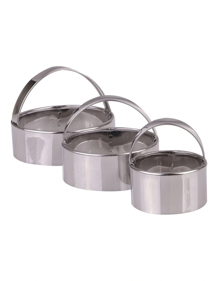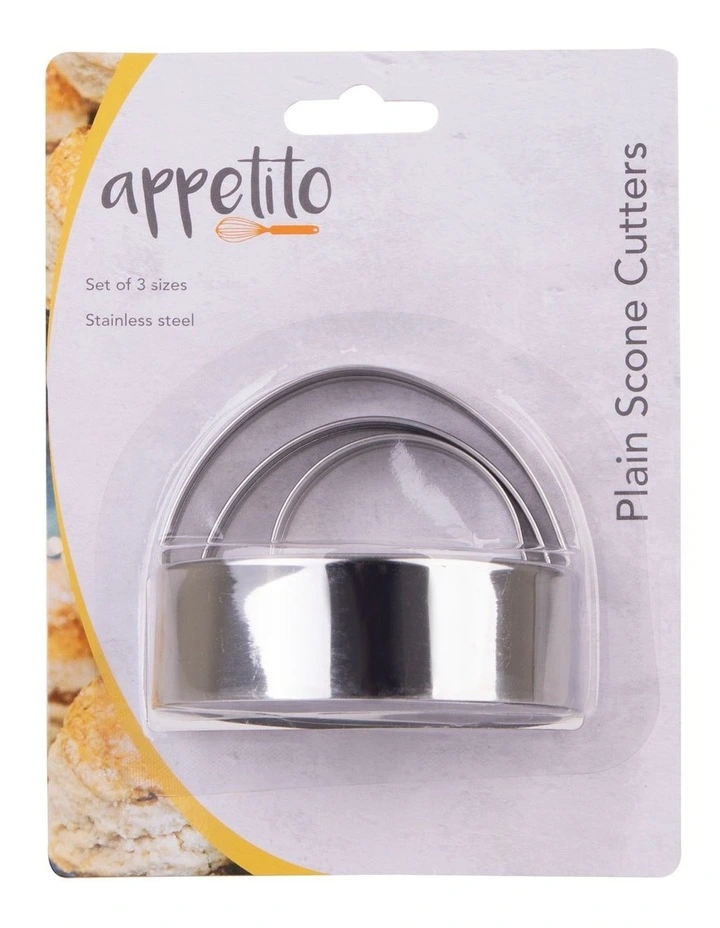 Whip up perfectly-sized scones, biscuits and pastries every time with these Appetito Plain Scone Cutters. The stainless steel set features three handy sized cutters 4.5cm, 6.5cm and 7.5cm diameter. with sharp cutting edges to easily pierce the dough without sticking or impacting the aeration process. Handles allow for easy cutting and even pressure and help to prevent finger marks on the scones or pastries.