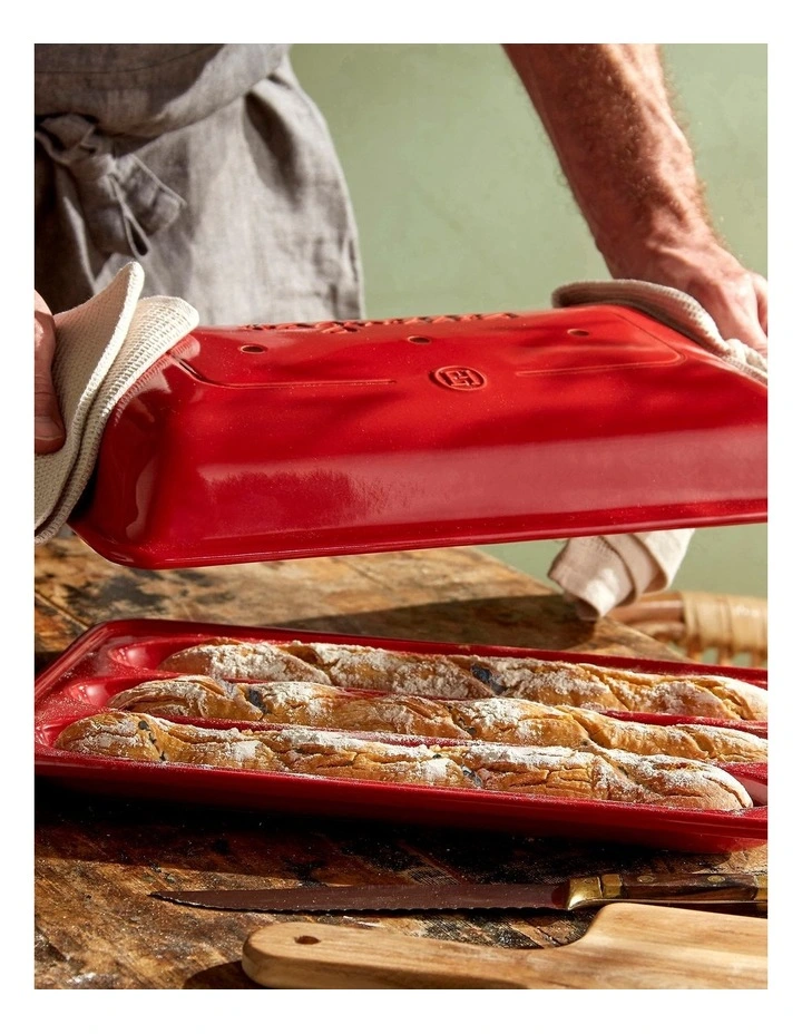 With the Emile Henry Baguette Baker, you’ll be making traditional French bread at home. The domed lid helps control the level of humidity to ensure a slightly crispy crust while keeping the inside moist and fluffy. And its small handles make it easy to hold and move. With the capacity to make three baguettes, there will be more than enough for everyone in the household.