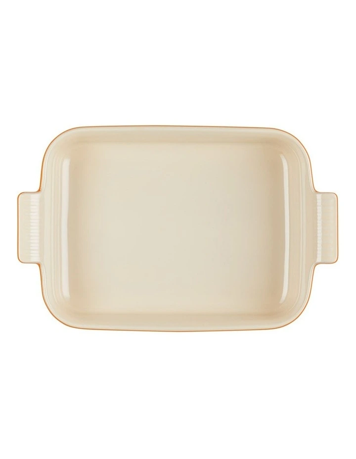 This stoneware larger sized rectangular dish is a kitchen essential and part of the Heritage collection inspired by Le Creusets original and elegant French designs as they were first presented in 1931. Authentic in style and function, its rectangular shape makes it a very versatile piece for everyday roasting, baking, marinating and serving. Featuring French inspired scalloped handles for effortless to move around and deep side walls provide plenty of cooking space.Β