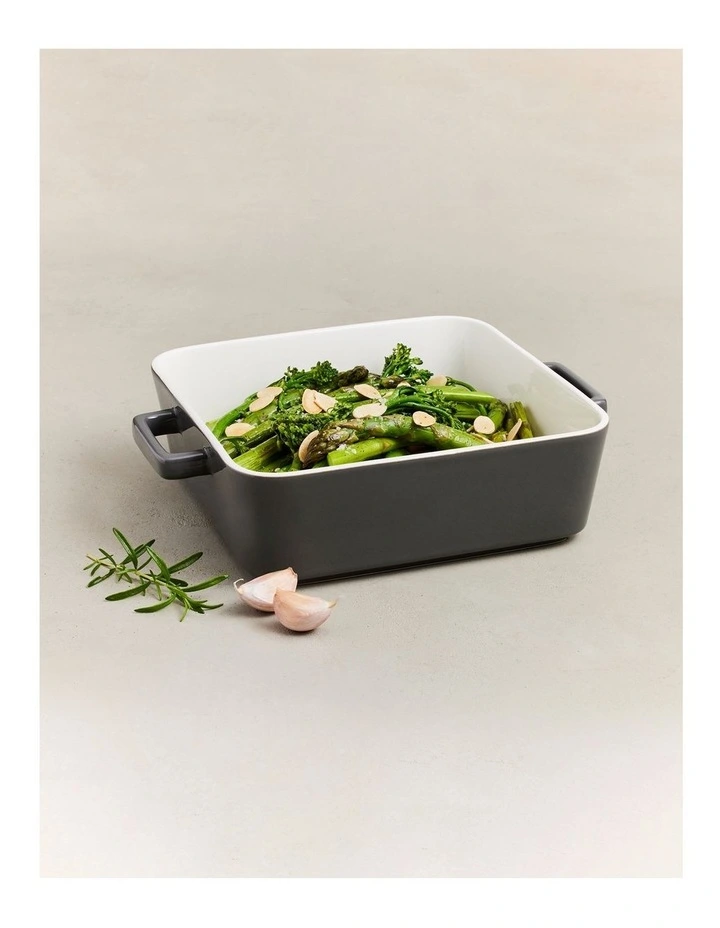 The Epicurious 24x8cm square baker is classic cookware with a contemporary edge. This statement bakeware is ideal for roasted vegetables and pasta bakes, giving you stunning presentation straight from oven to table. Made from quality porcelain, it features a rich charcoal-grey exterior finish that contrasts smartly with the white interior. Mix and match it with the rest of the Epicurious range for a beautifully coordinated kitchen collection.