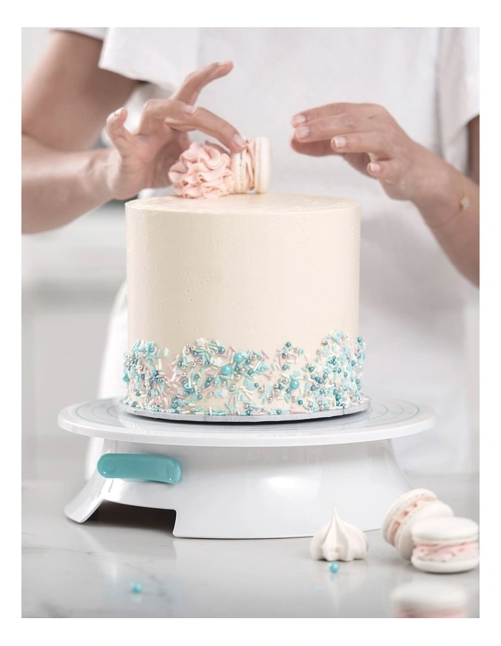 Features: Locking brake to secure cake when decorating. Raised base and non-slip feet for stability. Smooth rotating action with heavy duty ball bearing. Turntable platform markings in cm & inches for easy reference.