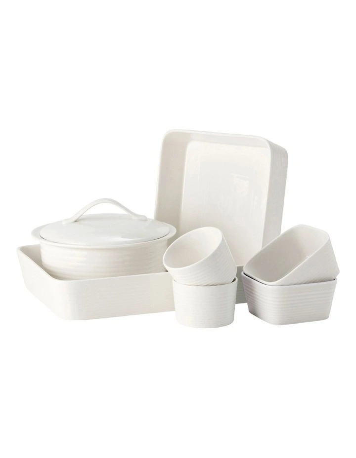 This 7-Piece Set is rendered in a beautiful white finish and consists of a Rectangular Roaster, Large Square Roaster, Covered Casserole dish, 2 Small Square Roaster, and 2 Ramekins. All are oven ready and presentable to serve on the table.